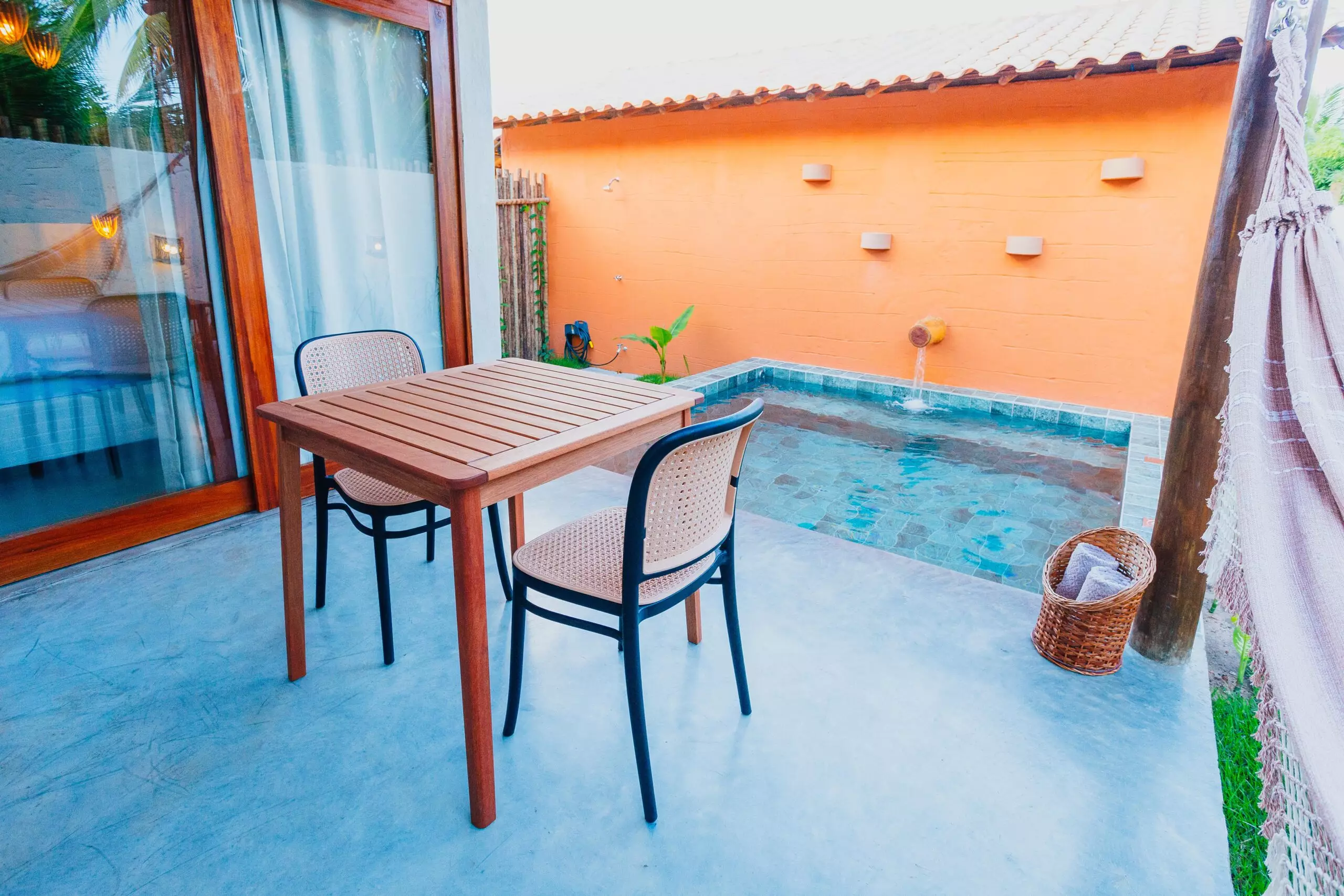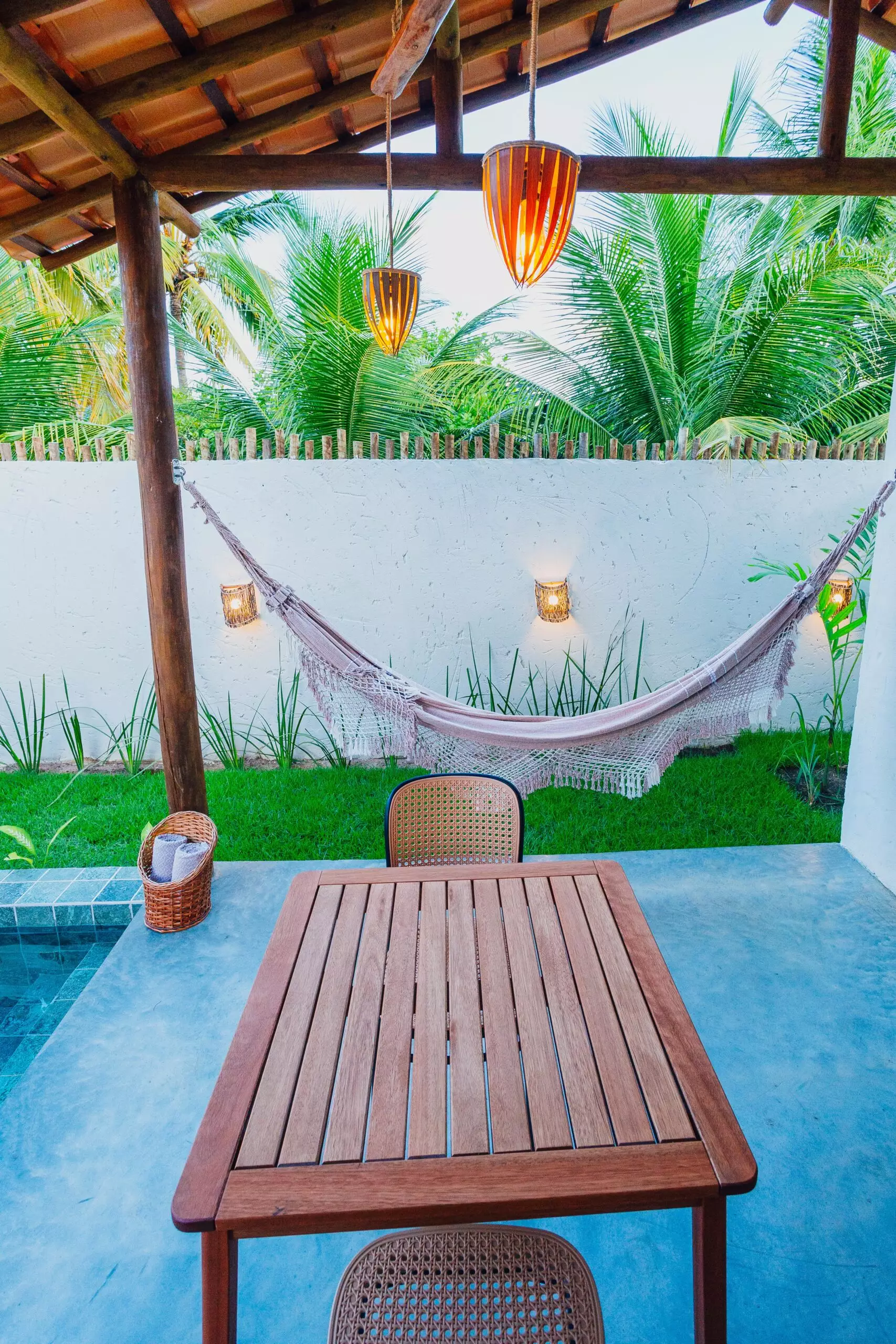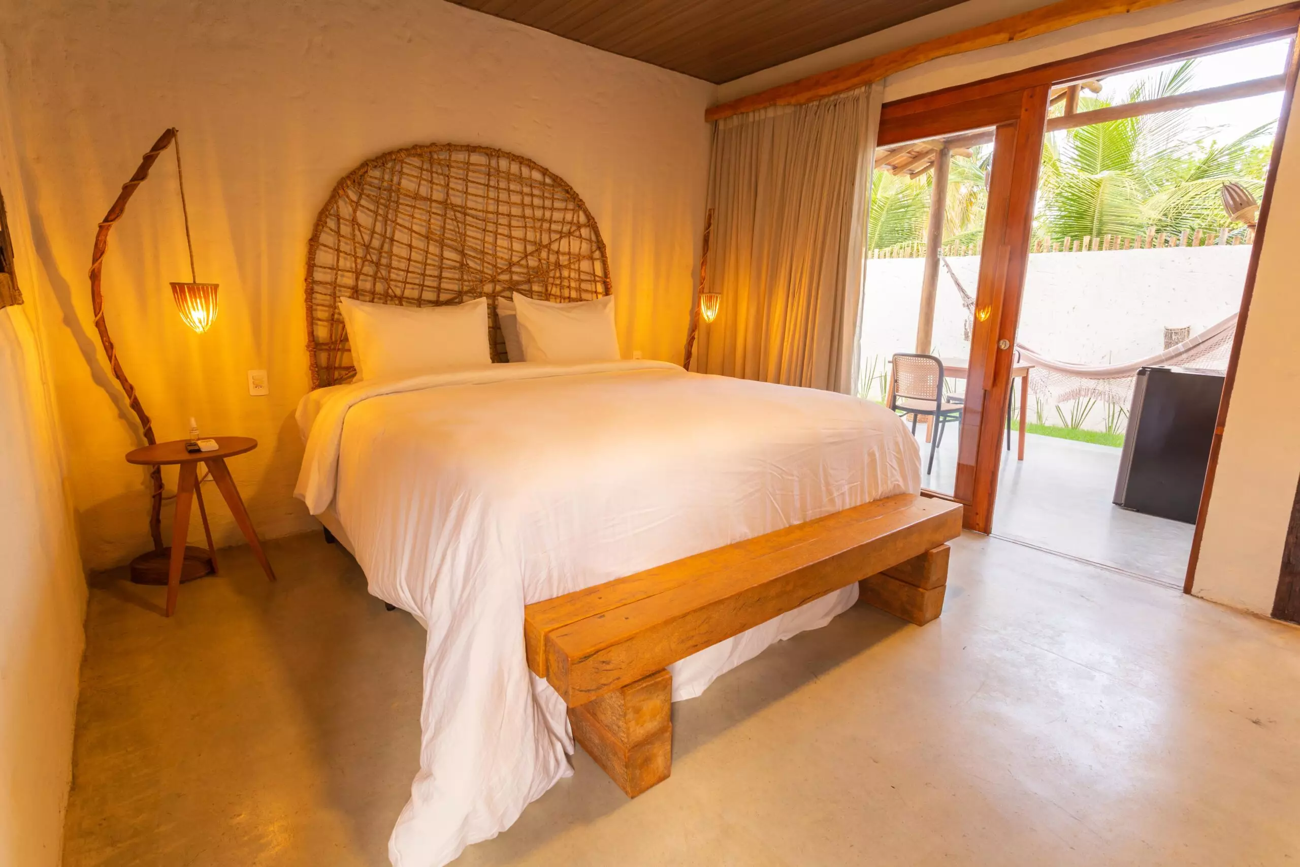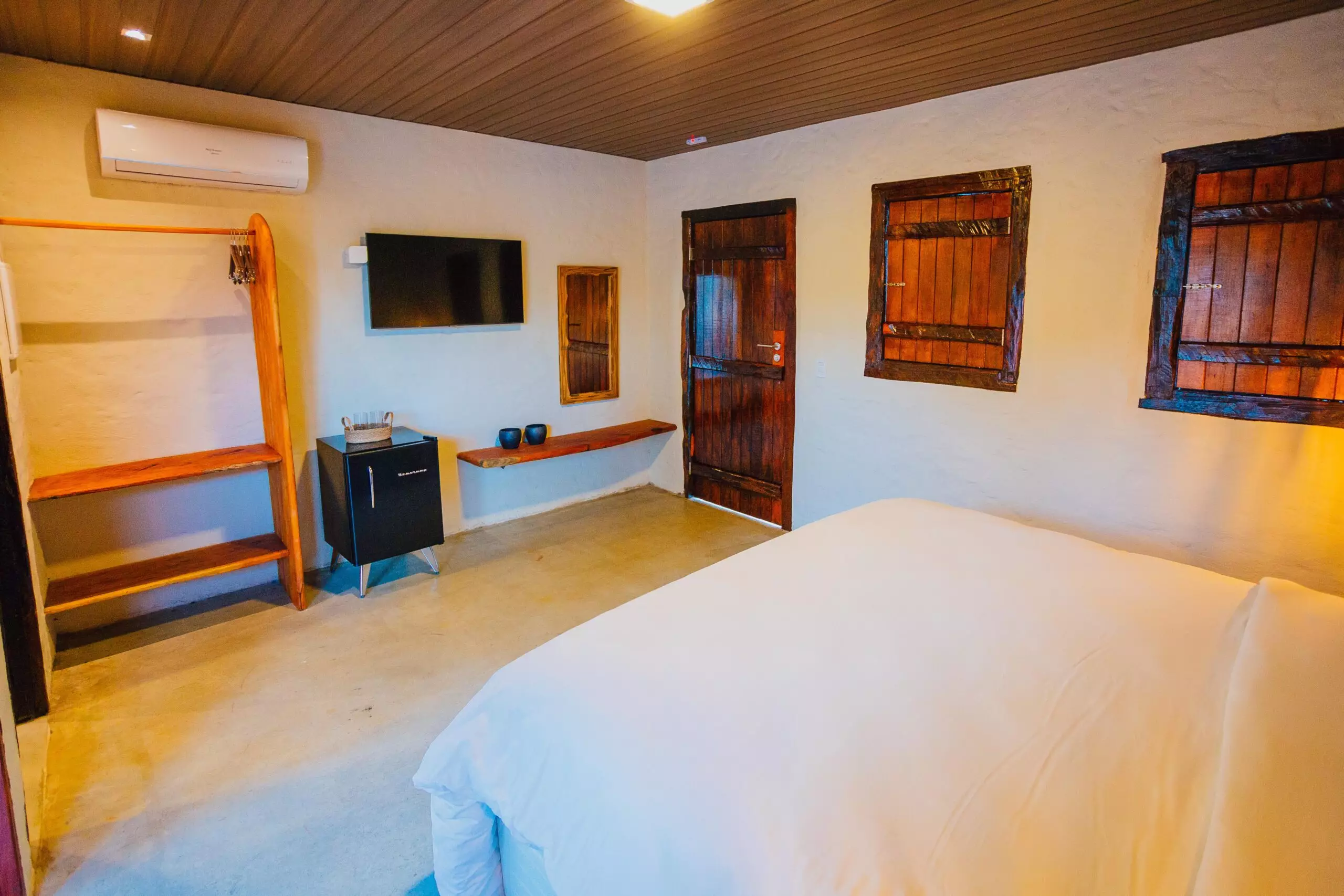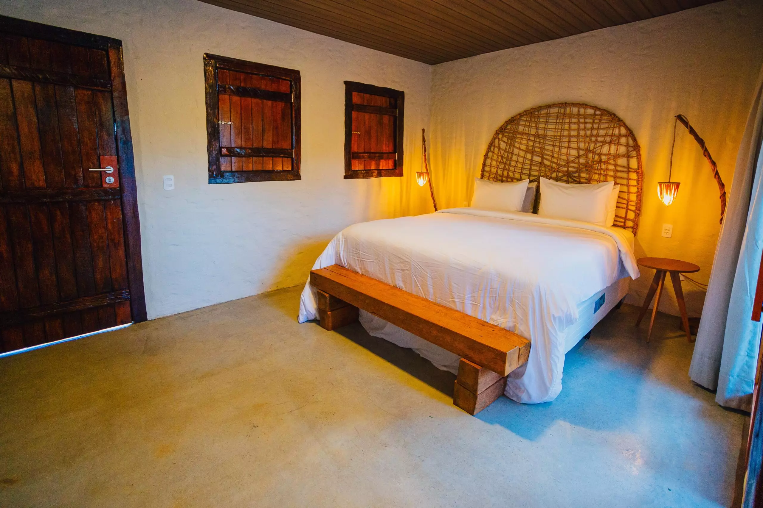Chalé privativo composto por arquitetura rústica em madeira de demolição e aliado a uma linda decoração artesanal de elementos de palha. Este chalé, além de bastante charmoso, também dispõe de muito conforto distribuído em seus 33 m². Conta com cama king size, smartv 42”, frigobar, split 12 mil btus, wi-fi, chuveiro elétrico e amenities na área interna. Na área externa você vai desfrutar de uma varanda realmente privativa composta com smartv 50”, mesa, cadeiras, rede e piscina privativa.